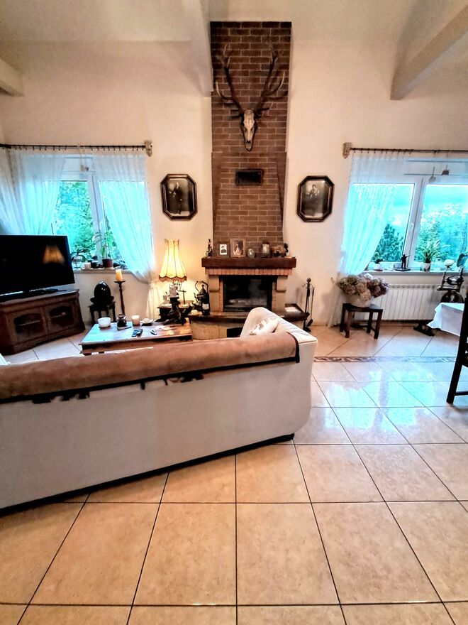 Dom posiada powierzchnię 250 m i ogrzewany jest piecem olejowym. W salonie znajduje się funkcjonalny kominek, który jest alternatywnym źródłem ciepła.
